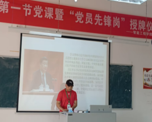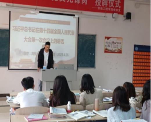 接着,由通识学院辅导员周星同志领学“习近平总书记在第十四届全国人民代表大会第一次会议上的讲话”。他提到强国建设、民族复兴的宏伟目标令人鼓舞,催人奋进。我们要只争朝夕,坚定历史自信,增强历史主动,坚持守正创新,保持战略定力,发扬斗争精神,勇于攻坚克难,不断为强国建设、民族复兴伟业添砖加瓦、增光添彩!周星同志正在领学