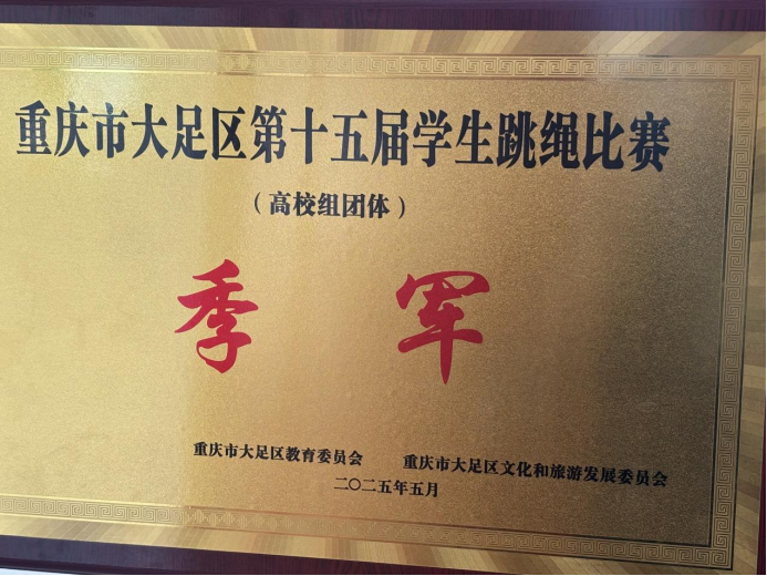 2025年5月22日—23日,通识学院24名学生参加由大足区教委与文旅委在体育运动中心举办 “大足区第十五届学生跳绳比赛”,获高校组团体季军。
