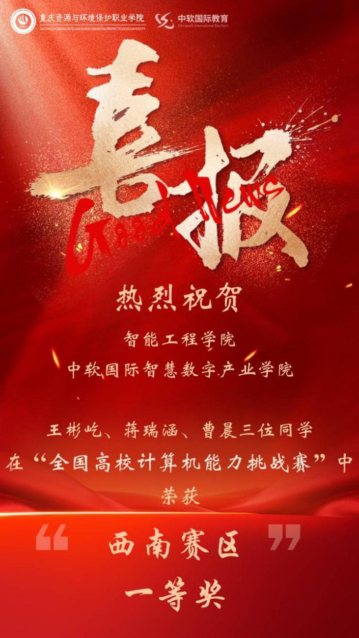 近日,全国高校计算机能力挑战赛西南赛区比赛在重庆落下帷幕。重庆资源与环境保护职业学院智能工程学院的王彬屹、蒋瑞涵、曹晨三位同学凭借出色的计算机技能和团队合作精神,荣获西南赛区一等奖。