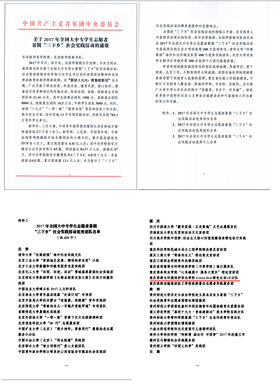 近日,在由团中央、全国学联联合中宣部、中央文明办、教育部共同开展的2017年全国大中专学生志愿者暑期“三下乡”社会实践活动中,我校荣获全国大中专学生志愿者暑期“三下乡”社会实践活动优秀团队。