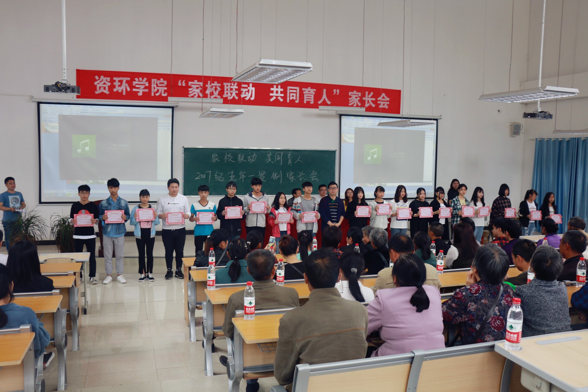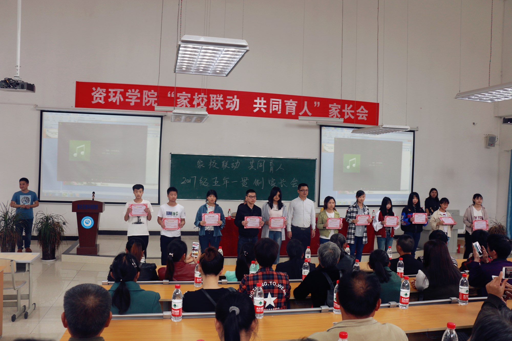 首先,学生处副处长龙行友老师宣读了学生奖学金的表彰决定。随后,学院领导分别为获得奖学金的优秀学生颁奖。接着,五名学生代表上台发言。学生辅导员代表杨川也就学生的教育和管理工作向家长们做了介绍。最后,姚木远书记代表学校对来参加家长会的家长们表示欢迎,对家长们一直以来对学院的关心和支持表示衷心的感谢,并介绍了学院的情况和学生教育、管理方面的相关情况以及改进措施,同时也希望家长能够配合学校,共同培养好学生,进一步形成学校、家庭、社会一股合力,共同育人,使学生德智体美全面发展。