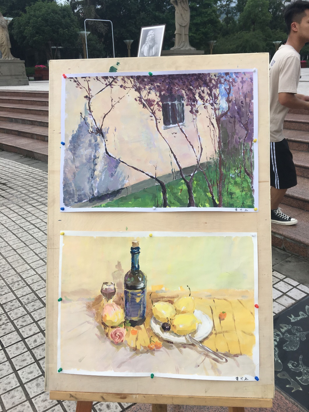 此次当绘画作品展览汲取和发扬传统艺术,得到了学院的重视和全系学生的积极响应和大力支持,本次活动展出40余幅绘画作品,涵盖素描、水粉、钢笔快题、马克笔快题等作品。包含抽象、写实、现代、后现代等风格;静物、风景、人物、动物等题材广泛,绘画作品在宽阔的广场上显示出生动的张力,给来来往往的市民一场丰富、深刻、惊艳的享受。