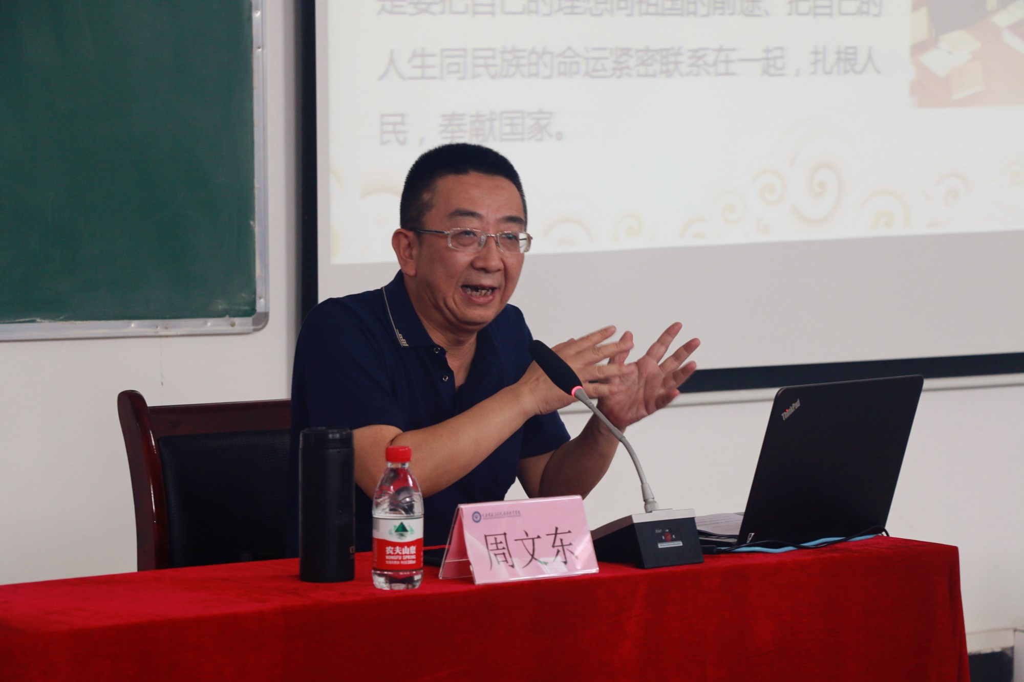 周文东围绕2018年在北大师生座谈会上习近平总书记又对青年学生提出了“爱国”“励志”“求真”“力行”的八字要求,讲授了四个方面。一是爱国,忠于祖国,忠于人民。青年学生牢记作为社会主义建设者和接班人的使命担当,身怀爱国之情,砥砺强国之志,才能实践报国之行,为全面建成小康社会、全面建设社会主义现代化强国而努力奋斗。二是励志,立鸿鹄志,做奋斗者。古之立大事者,不惟有超世之才,亦必有坚忍不拔之志。”立志是一切开始的前提,改变自己,从努力开始,要有担当,要有奋斗,当代中国青年要有所作为,就必须投身人民的伟大奋斗,同人民一起奋斗,青春才能亮丽,同人民一起前进,青春才能昂扬。三是求真,求真学问题,练真本领。“学所以益才也,砺所以致刃也,”要把基石打深、打牢。“学而不思则罔,思而不学则殆。”要把学习作为首要任务,作为一种责任、精神追求和生活方式,要孜孜不倦学习,以良好的学风锻造做人的风格。四是力行,知行合一,做实干家。“知者行之始,行者知之成。”力行须知行合一、以知促行、以行求知。青年学生要积极投入到“四个伟大”的历史使命中去,要以青春无边,奋斗以成。