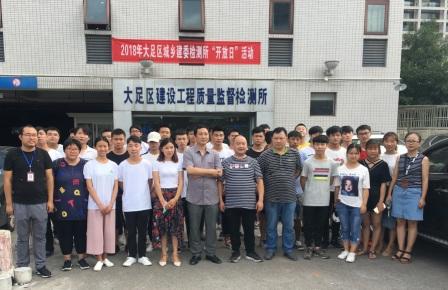 6月27日下午,学生们队伍整齐的来到了大足区工程质检所,我校师生受到了大足区质检所杨谦所长、贺昌友副所长等人的热烈欢迎。首先,由贺副所长全程带领学生参观并介绍了质检所的各种仪器的功能及使用方式。然后,学生以小组的方式分别对钢筋、水泥、混凝土、岩土等多个试验室进行参观学习,并纷纷拿出笔记本记录。针对学生的疑惑实验员从专业的角度进行了详尽的解答。