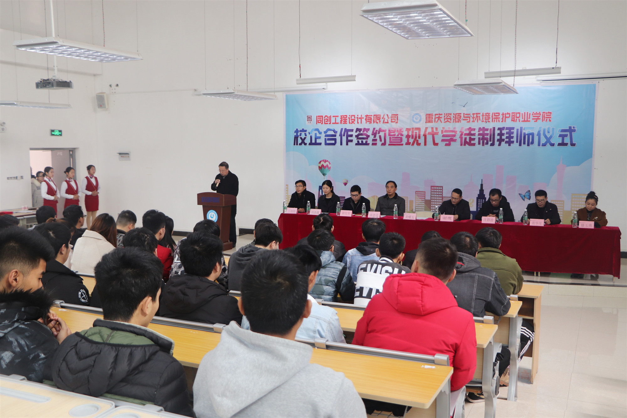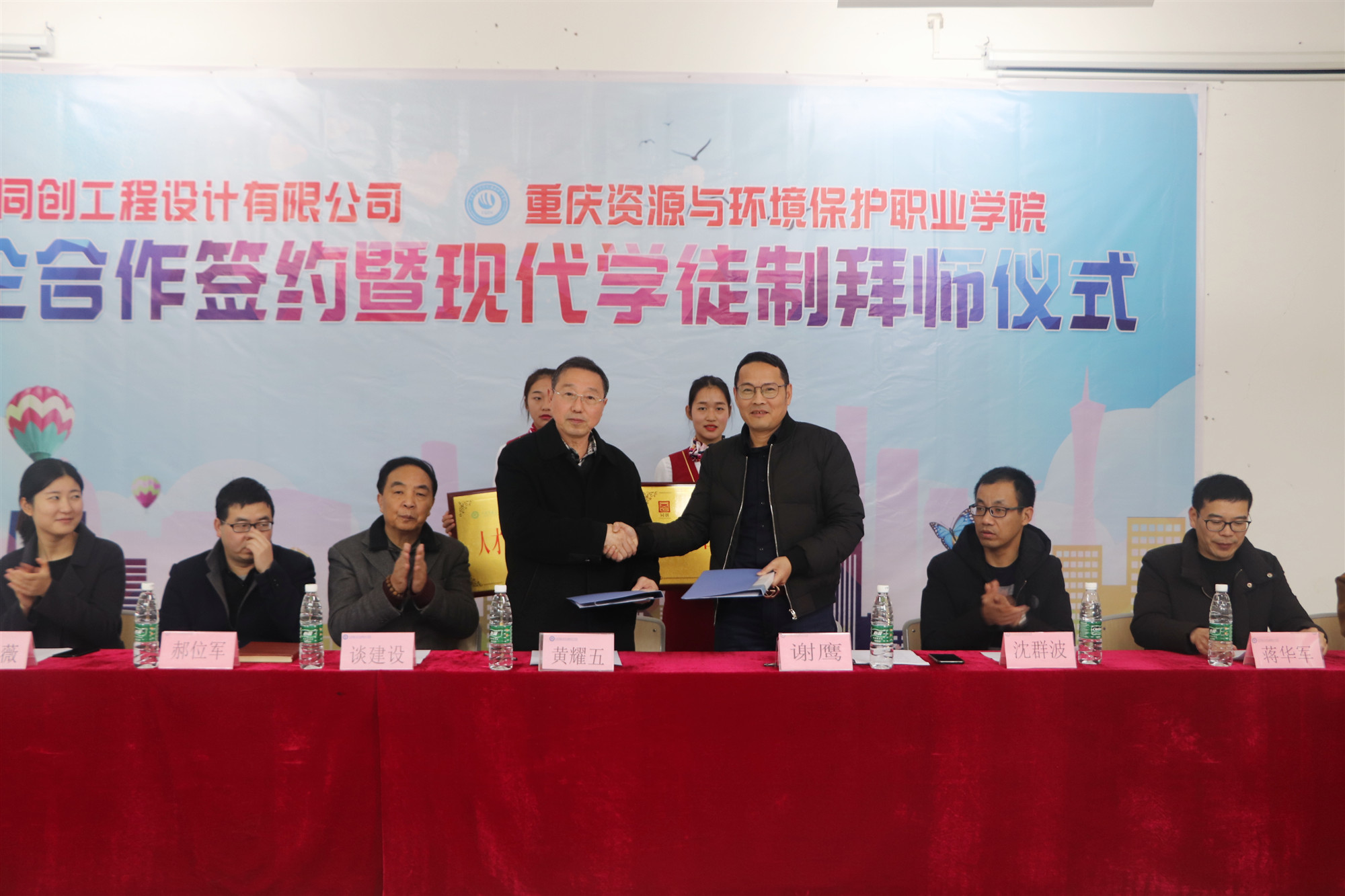 随后,同创工程设计有限公司监理分公司总经理谢鹰介绍了公司的相关情况,以及同创校企合作具体内容,随后双方共同签订了校企合作协议并互赠合作授牌,同创订单班的学员还进行了拜师仪式。最后,谢总一行人来到学院三楼会议室与学院进行了校企协同育人人才培养方案的讨论。