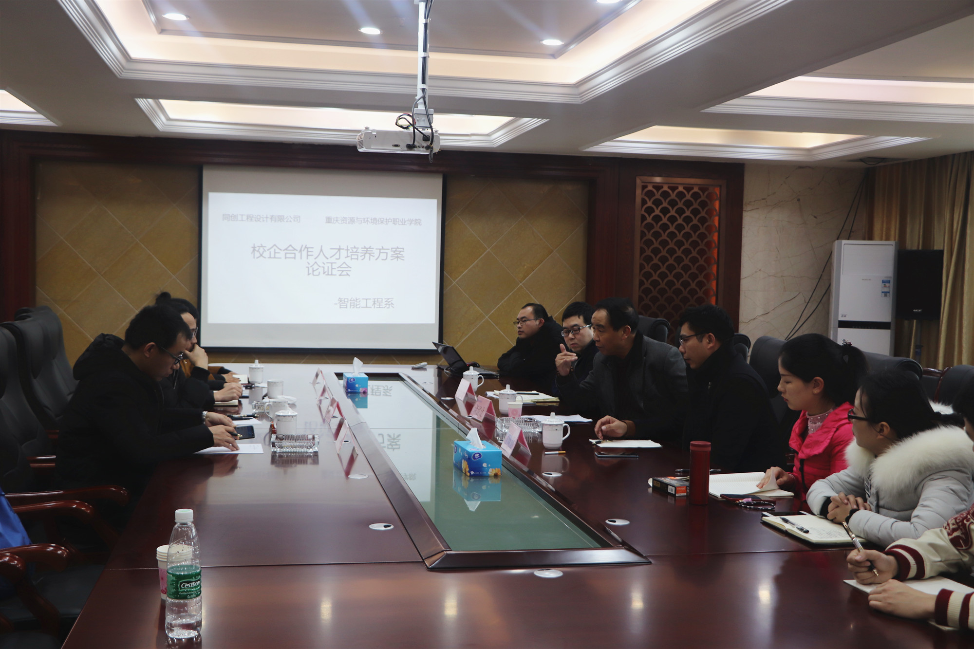 黄耀五院长首先代表全校师生热烈欢迎浙江同创工程设计有限公司一行人莅临我校指导专业建设,随后黄院长提到:为深入贯彻落实《国务院办公厅关于深化产教融合的若干意见》的精神,推进人力资源供给侧结构性改革,促进教育链、产业链、创新链有机衔接,全面提高教育质量,扩大就业创业,培育经济发展新动能,推进经济转型升级,重庆市政府近期颁布了《关于深化产教融合的实施意见》,市政府要求:深化产教融合人才培养改革,推进产教协同育人,推进职业院校与企业联盟,全面推行现代学徒制和企业新型学徒制,推动学校招生和企业招工相衔接,明确学生学徒“双重身份”,强化学校和企业“双主体”实施,推进学历与技能并重的人才培养模式。强化教学、学习、实训相融合的教育教学活动,推行项目教学、案例教学、工作过程导向教学等教学模式。加强产教融合师资队伍建设,支持企业技术和管理人才到学校任教,教师到企业担任兼职工程师或技师,畅通人才双向流动渠道。实施产教融合发展工程,支持一批职业学校开展校企合作,共建共享技术技能实训设施,建成一批校企协同育人的“双基地”和产教深度融合的实训基地。