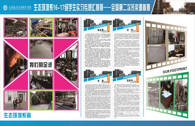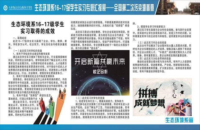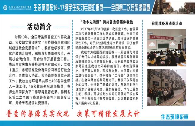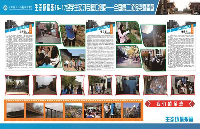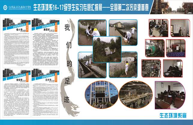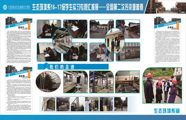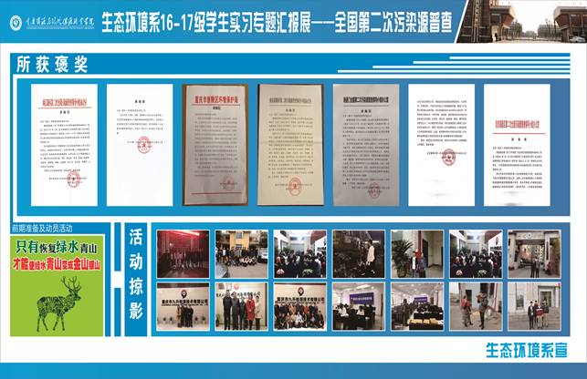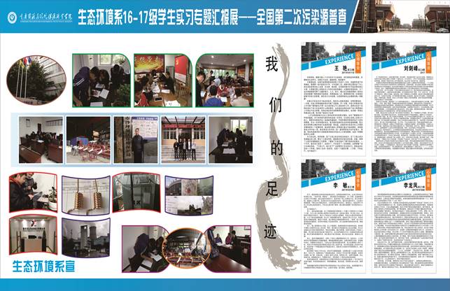 2018-2019学年度第一学期,我系2016级顶岗实习和2017级专业实习的圆满完成。此次实习历时4月之久,同时为配合地方保质保量完成全国第二次污染普查,先后派出500多名师生,不畏辛苦,从填表、入户、信息采集及审核全流程参与,足迹遍布3省市20多个区县,近万家企业。在师生们共同努力之下,不仅保质保量完成了实习工作,更得到两江新区、武隆区等地区二污普领导小组的高度认可。大大提高了行业及区域对我校的认可度和知名度。为传扬此次实习精神,鼓励学生 “学以致用”,特在2018-2019学年度第二学期开学,这充满希望与激情之时,举办2016级、2017级学生实习专题汇报展。