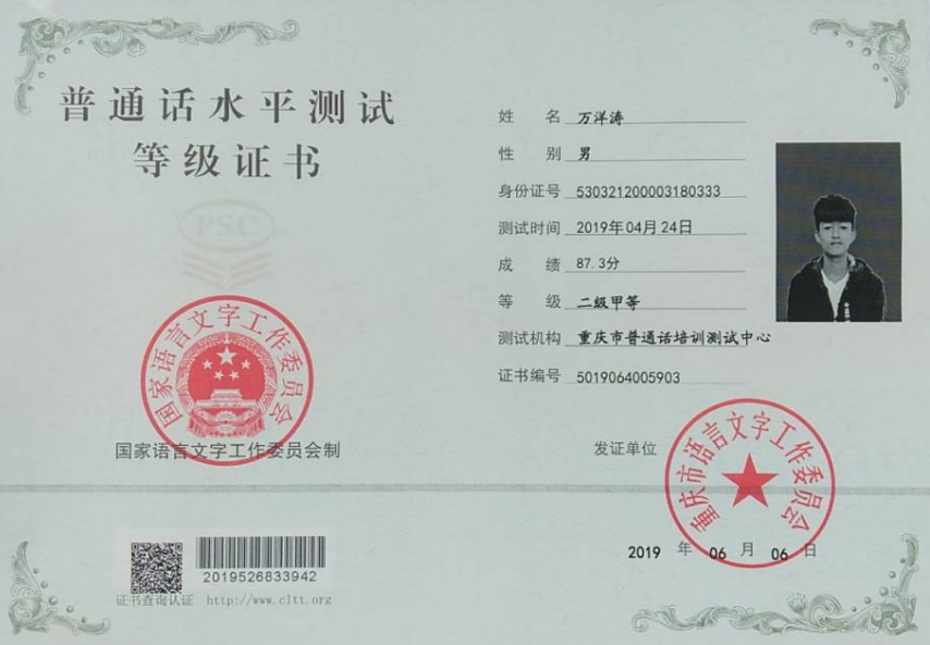 本次考试,根据成绩可获得由国家语言文字工作委员会统一制作的相应等级的《国家普通话水平测试等级证书》。我院参加测试的345名师生全部获得测试证书,其中二级甲等17人,占全部测试人员的4.93%;二级乙等179人,占全部测试人员的51.88%;三级甲等144人,占全部测试人员的41.74%;三级乙等5人,占全部测试人员的1.45%。