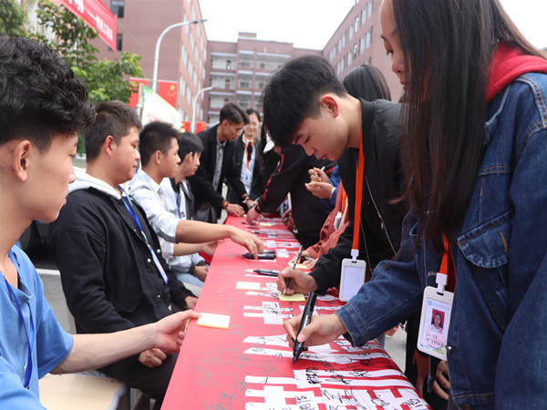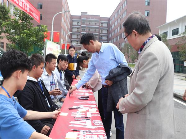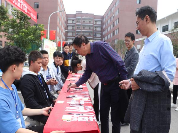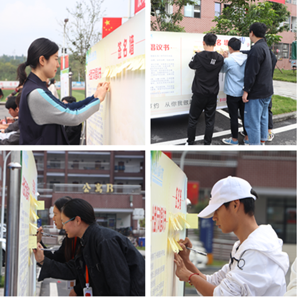 活动以横幅签名的形式进行,吸引了众多师生的参与。校长黄耀五、书记陈远刚、副校长谈建设等校领导和各职能部门、系部的领导老师纷纷在横幅上签上了自己的名字,以身作则,践行光盘行动。在领导老师的带领下,同学们也纷纷在横幅上签上了自己的名字,同时在签字墙上贴上用便签纸写下光盘行动的承诺,一笔一划记录下了大家践行“光盘行动”的决心。