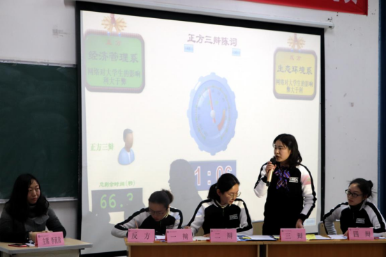 比赛由4个辩论队共进行三场比赛,前两组为小组PK赛,获胜组分别是基础教育系代表队和经济管理系代表队,直接晋级决赛。第三组为复活赛,生态环境系代表队取得了复活赛的胜利,也成功晋级决赛。