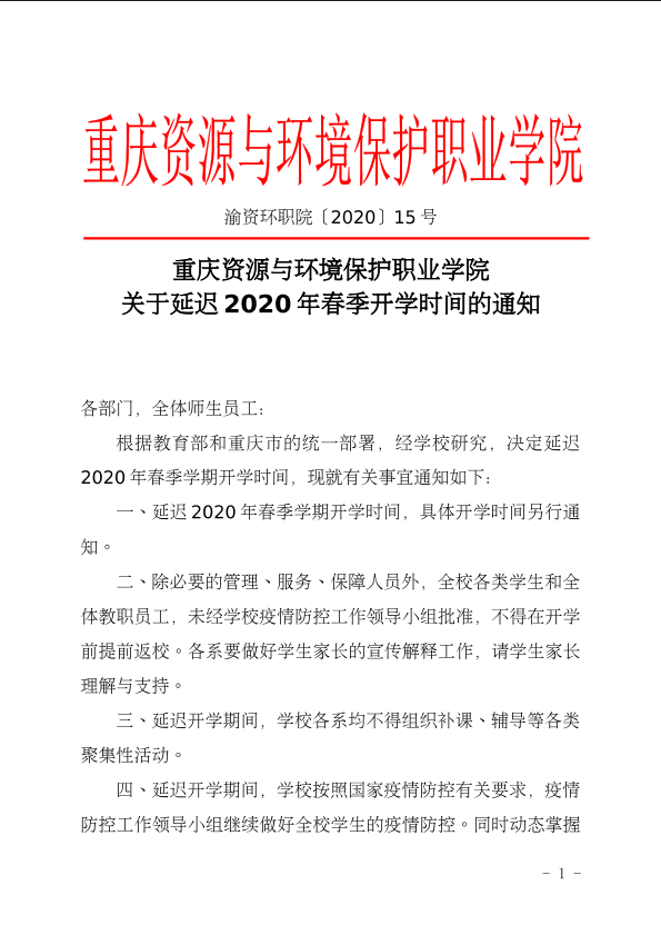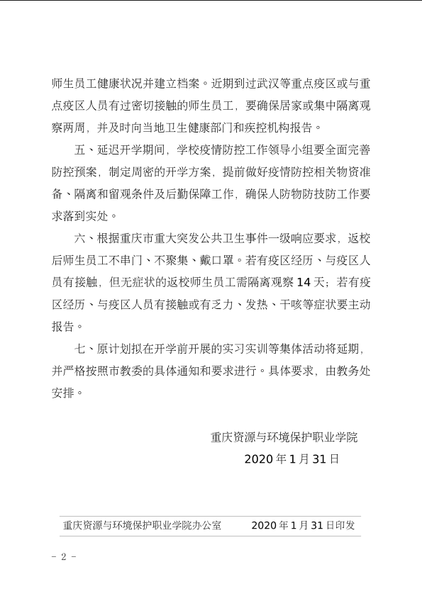 上一篇:重庆资源与环境保护职业学院关于新型冠状病毒疫情防控期间加强校园管理的通知