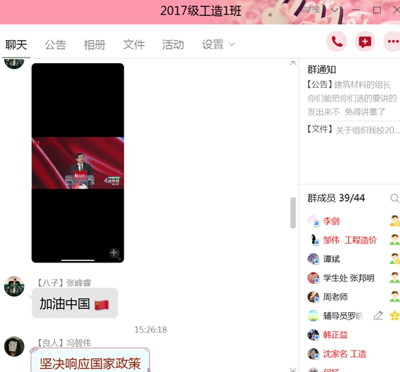 与此同时,师生通过学生班级群、辅导员群、党支部群、微信等网络通讯展开了积极的讨论。师生们纷纷表示,通过本次课程,充分感受到了党中央的强大凝聚力,明确了作为一名当代大学生和教育工作者的责任与担当。