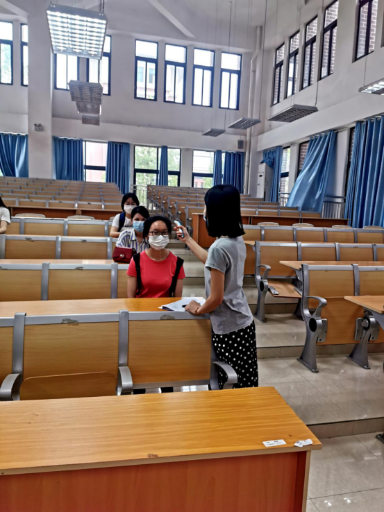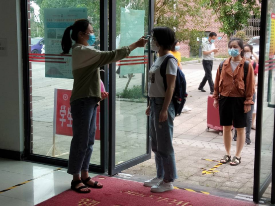 学生通过体温检测合格并提交相关资料进入校园,到达教学楼还会进行一次体温的检测,每个教室间隔落座,确保学生之间保持安全距离。