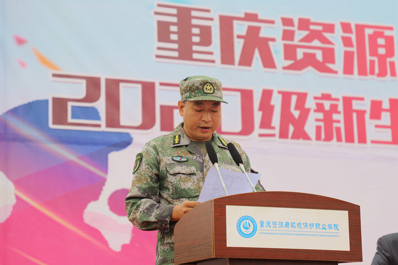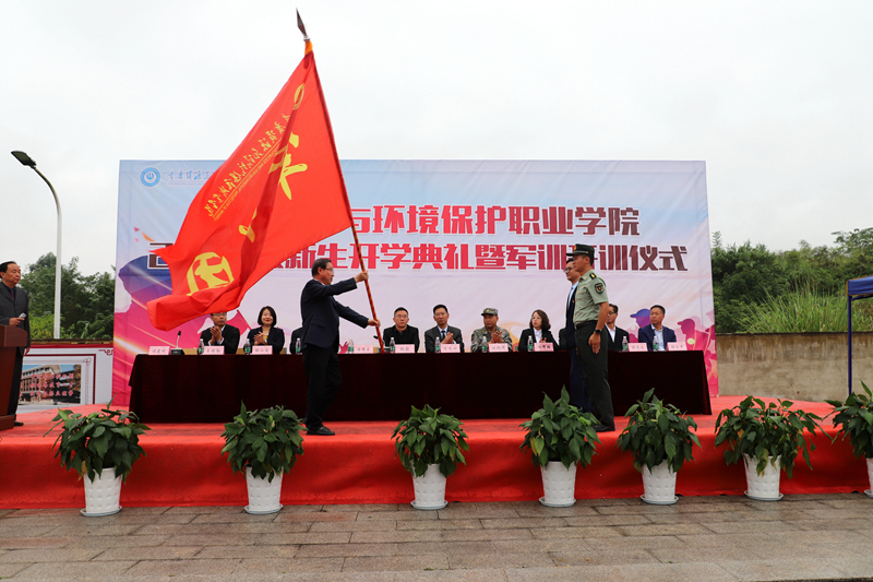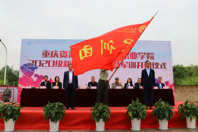 黄耀五校长向重庆资源与环境保护职业学院2020级军训团授旗。