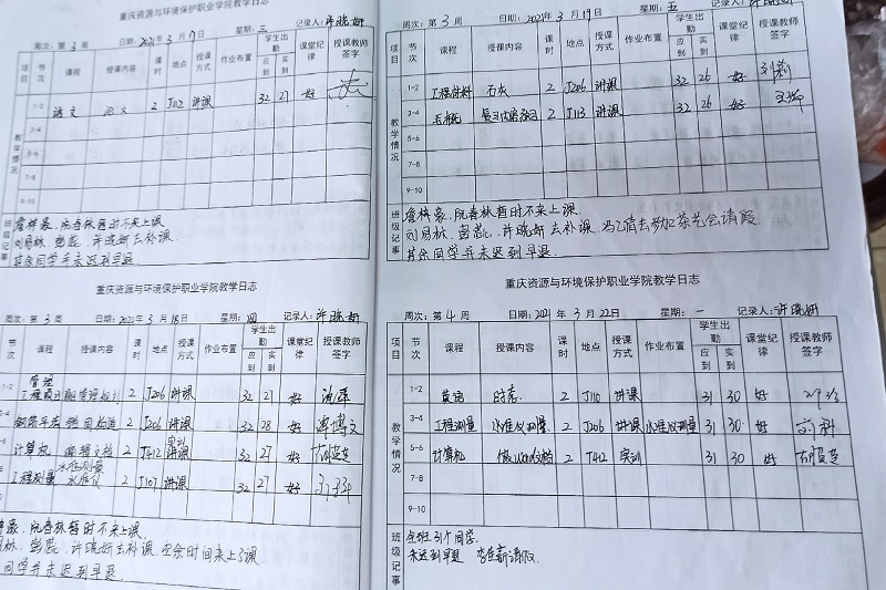 5月13日,教务处深入各二级学院进行重点抽查,对教学材料、巡课记录等教学运行资料的具体落实及书写规范等进行详细检查。认真记录本次检查存在的问题,并当场反馈给教学秘书,要求及时落实整改。