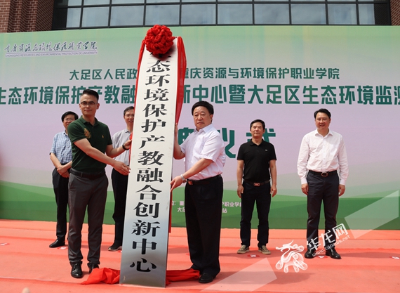 重庆市大足区人民政府副区长杨烈、市生态环境监测中心主任刘强和重庆资源与环境保护职业学院校长王平为生态环境保护产教融合创新中心成立揭牌。