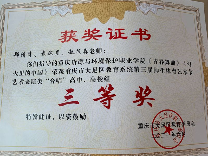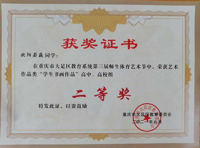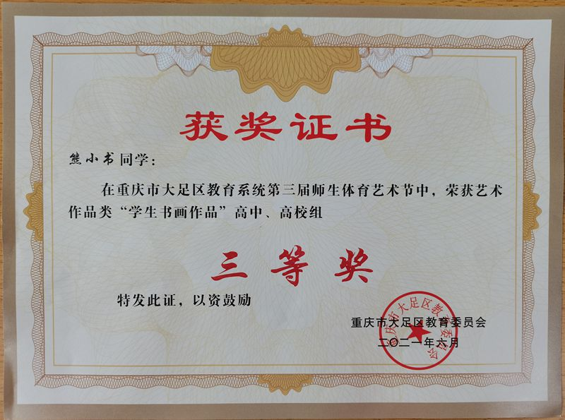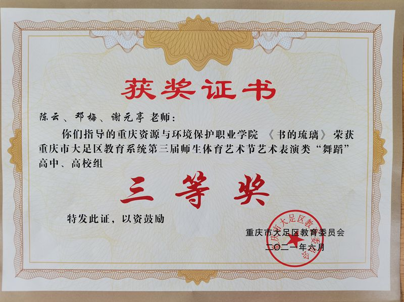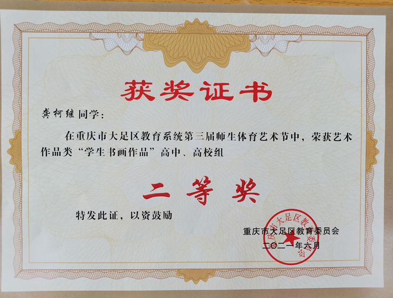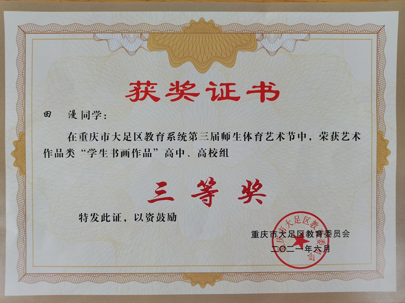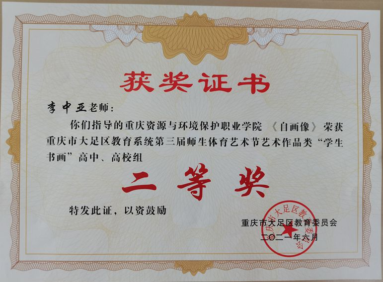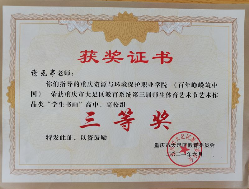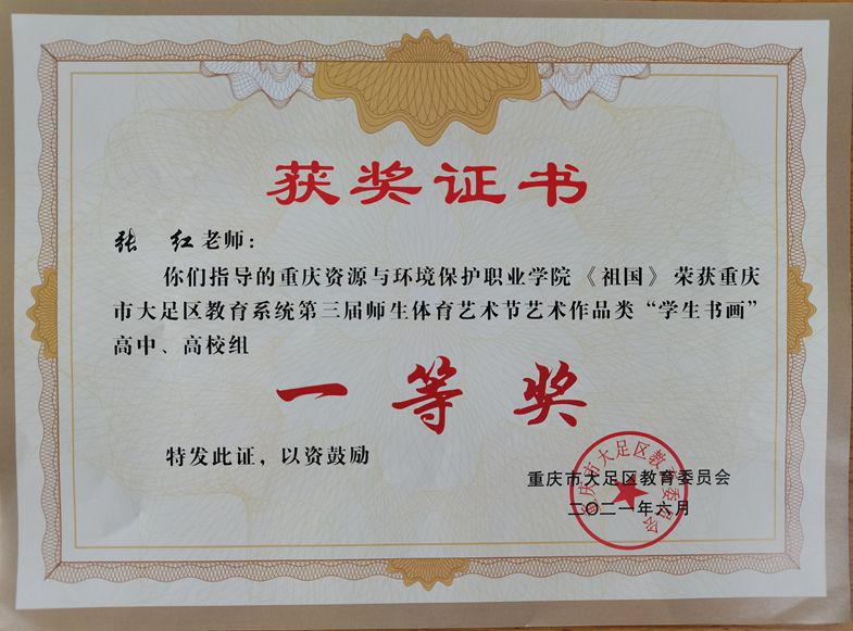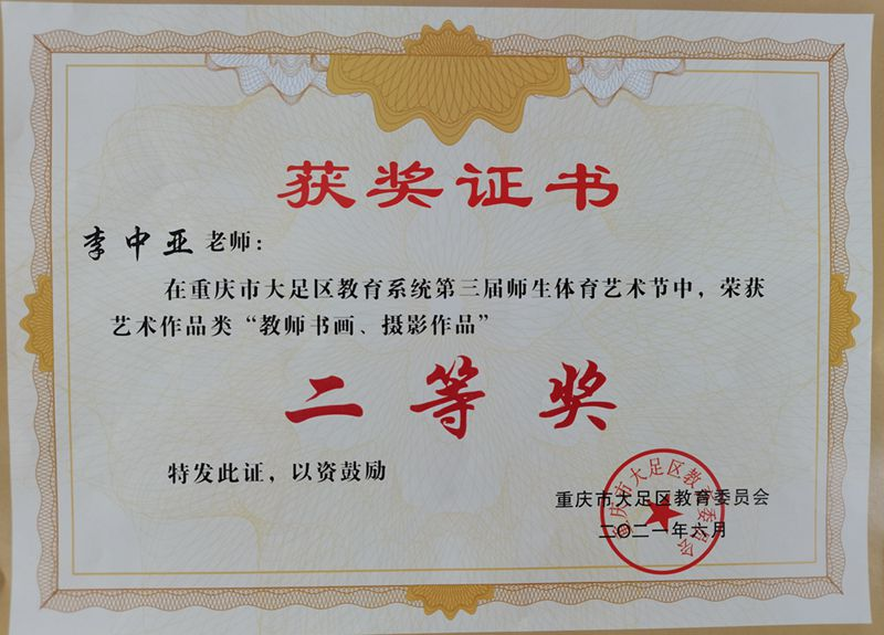 大足区庆祝“建党100周年”暨第三届师生体育艺术节,我校教育与体育学院喜获丰收,共计7件作品获奖。其中学生组获奖5件,游玉莲同学获得一等奖;龚柯继、欧阳蔚巍同学获得二等奖;田漫、熊小书同学获得三等奖。教师组获奖2件,张红老师、李中亚老师个人作品均获得二等奖。且张红老师荣获本届作品展指导教师一等奖;李中亚老师获指导教师二等奖;谢元亭老师获指导教师三等奖;陈云、邓梅、谢元亭老师获指导老师三等奖;郑清秀、袁婉月、赵茂森老师获指导老师三等奖。