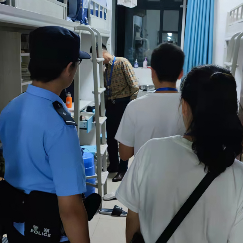 为了维护我校正常的生活秩序,加强校风校纪和安全文明校园建设,保障学生宿舍安全及学生的人身安全,营造安全、健康的生活氛围。9月15日晚上8点30分,校长助理朱凯、学生处、保卫处、东门派出所民警、各二级学院人员深入学生宿舍开展安全隐患排查工作,对我校学生有无管制刀具、寝室卫生、寝室内大功率电器及违规电器使用情况、寝室安全隐患等进行了仔细检查。