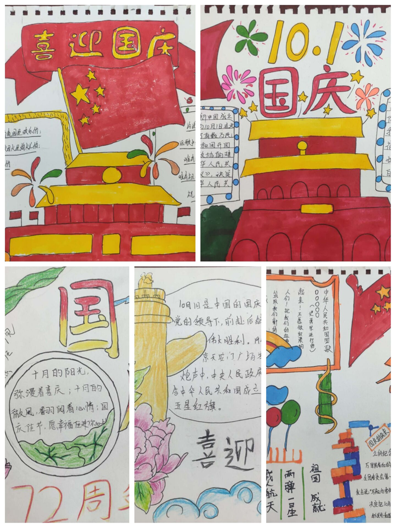 为能表现学生自己心目中的祖国特组织"喜迎国庆"手抄报活动,学生们积极参与,用自己的智慧和双手,制作出了一张张精美的画卷。作品不仅色彩丰富、图文并茂、书写美观,给人以赏心悦目的感觉,而且标题醒目突出,版面设计新颖独特,用画笔充分表现了对祖国热爱和自己的爱国主义情怀。"