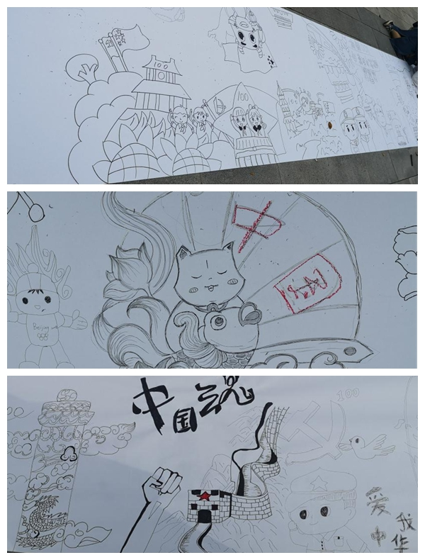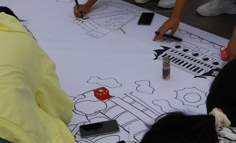 活动中,同学们围在长长的画布前,拿出准备好的画笔工具,认真地在画布上表达着对于祖国和革命先辈们的崇敬之情。将祖国的繁荣富强和人民的幸福生活拼成一幅鼓舞人心的画卷。