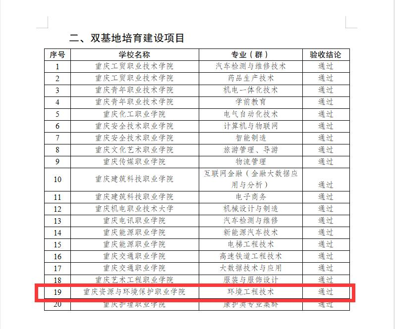 近日,重庆市教育委员会公布了《重庆市教育委员会 重庆市财政局关于开展职业教育校企合作示范项目和双基地建设项目终期验收的通知》(渝教职成函〔2021〕39号),我校环境工程技术专业双基地建设项目通过终期验收。