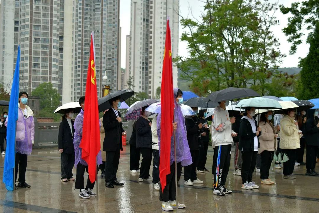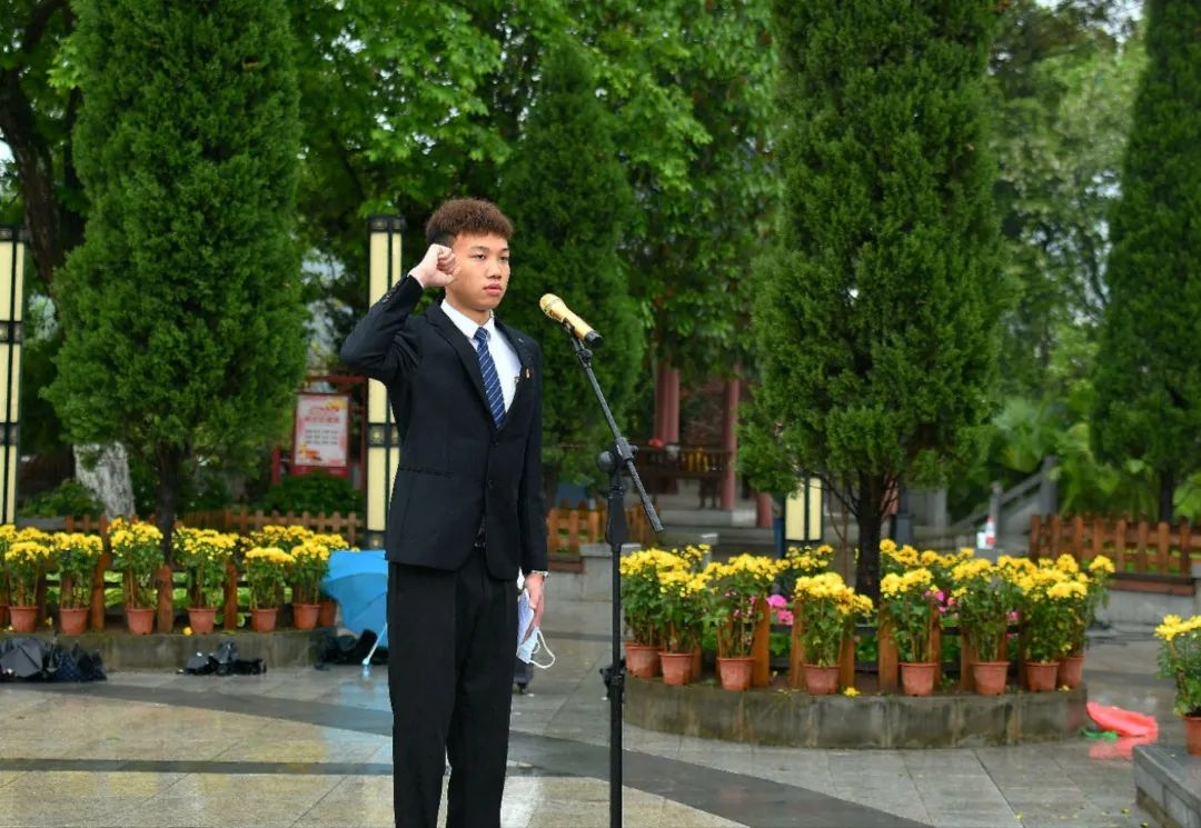 学生代表彭真带领志愿者在烈士纪念碑面前庄严宣誓。