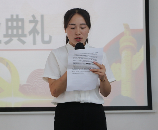 参培学员代表段小冉发言。他总结此次党课学习的心得体会,以自身经历为例,表示作为一名新时代的青年要肩负新时代的历史使命,坚定早日站在党旗下的决心。