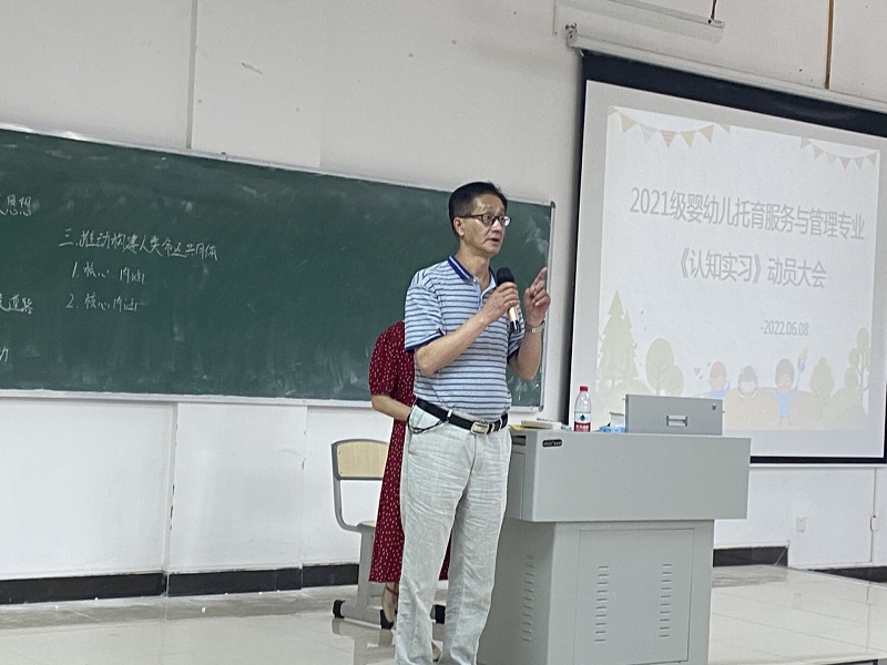 认知实习是学前教育专业及婴幼儿托育服务与管理专业教学计划的重要组成部分,根据2021级人才培养方案组织了专业认知实习。2022年6月8日,我院组织召开学生认知实习动员大会,由教育与体育学院院长骆真波向学生们讲解本次见习的注意事项,特别强调作为一名幼教工作者时刻保持自己的言行、穿着得体,作为资环学子时刻保持学校形象