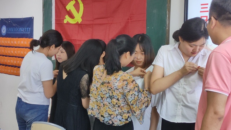 会议讨论接收赵丽欣老师为中共预备党员。赵老师向党组织汇报对党的认识、入党动机、个人经历以及在校工作表现等情况。经与会党员酝酿讨论、充分发表意见后,会议采取正式党员无记名投票表决的方式,一致同意赵丽欣同志为预备党员,并接受党组织的进一步考验。主题党日在全体党员齐唱《没有共产党就没有新中国》中拉开序幕,党员们用铿锵有力的歌声表达对中国共产党的无限爱戴和共产党员矢志不渝的初心。在马小凤老师带领下,预备党员进行了宣誓,老党员重温了入党誓词,王晓勤、罗晓兰、马小凤、胡亭四名党员为今年发展的预备党员佩戴党徽。共产党人的生命有两个起点,一个是自然生日,昭示生命开始,一个是政治生日,提醒激励党员,时刻不忘初心、牢记使命。我支部周晓琴、谢琴两名党员在7月份入党,为两位同志过“政治生日”,使他们牢记党员身份,永葆初心使命。两名党员分享了自己的入党故事,回顾自己的成长历程和入党以来的追求与表现,总结成长过程中取得的成绩,查找自身存在的不足,明确今后的努力方向,畅谈自我感言,为主题党日活动送上“生日回礼”。