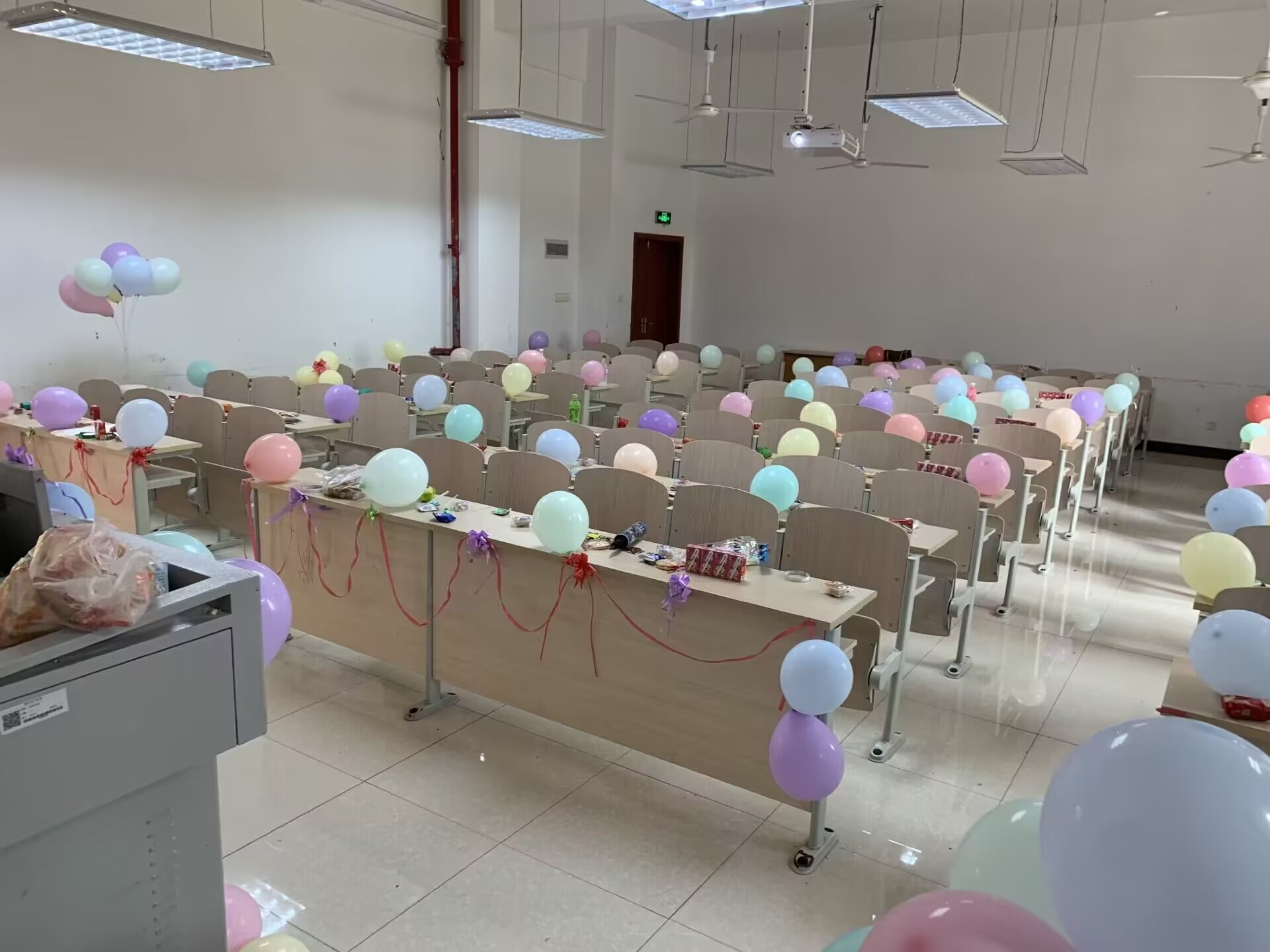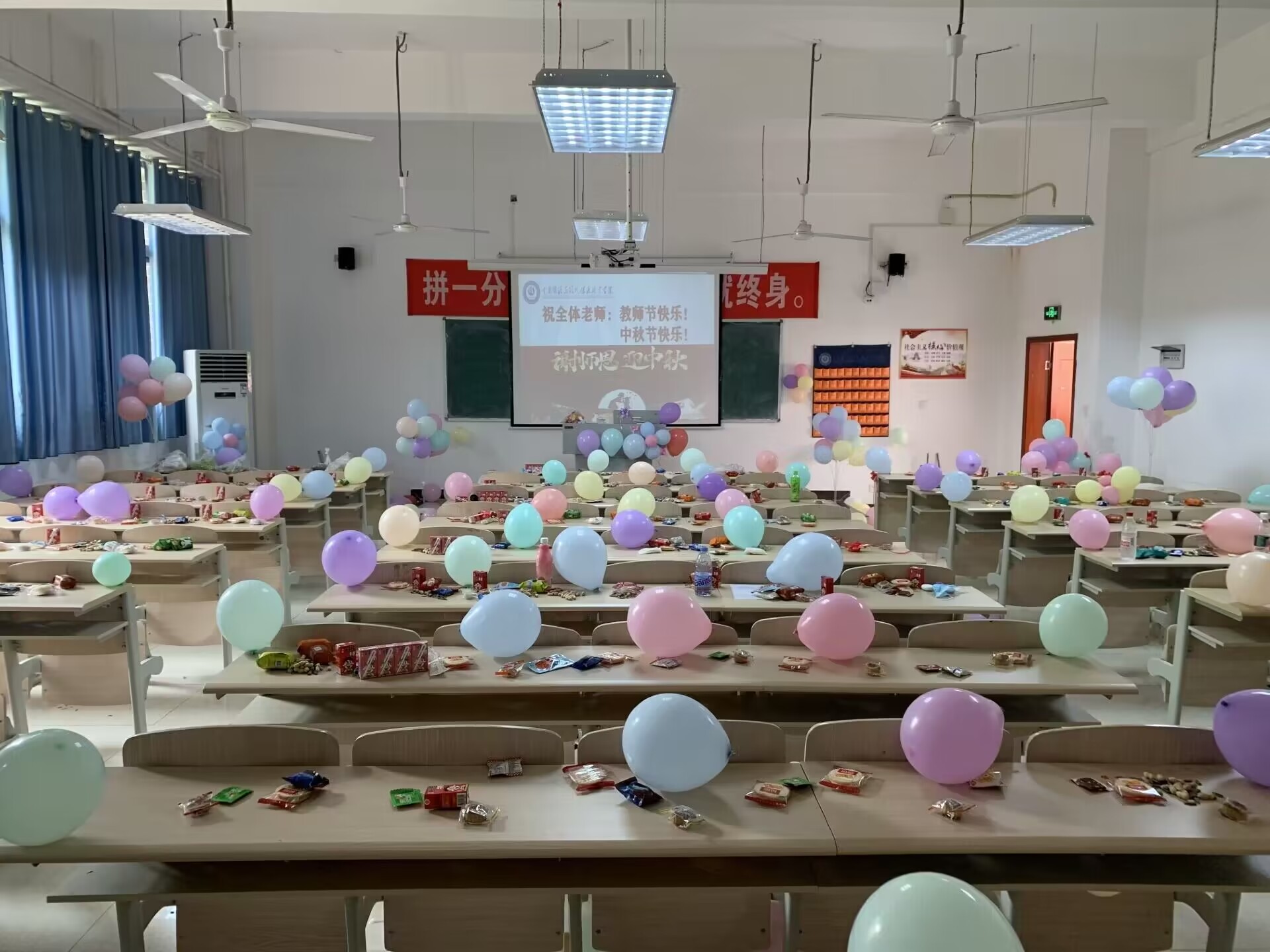 上午10:00,同学们进教室吹气球、组装、装扮教室、分发月饼、摆水果,活动现场进展得如火如荼,大家忙得不亦乐乎。看,通过一双双巧手装点,我们的教室氛围十足,就等同学们到来。