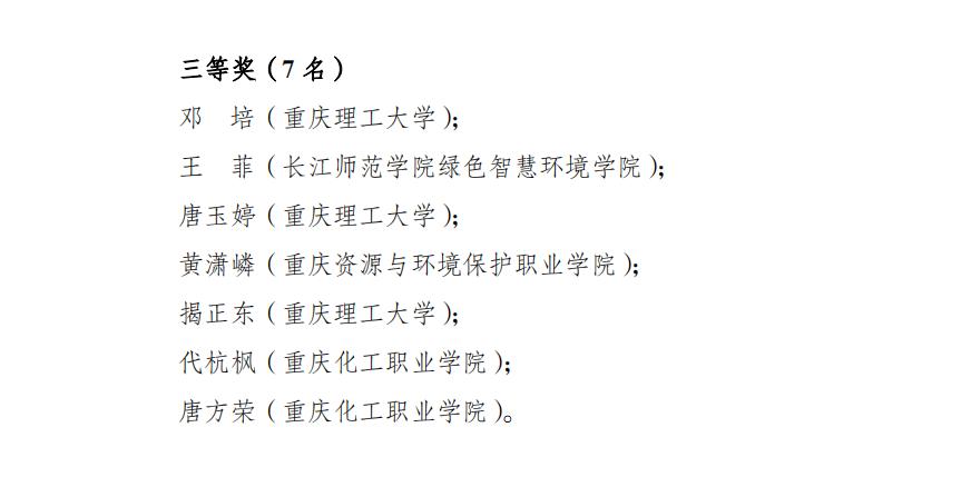近日,重庆市首届社会生态环境监测行业理论大赛成功举办。生态环境学院学生黄潇嶙在比赛中荣获三等奖1项。