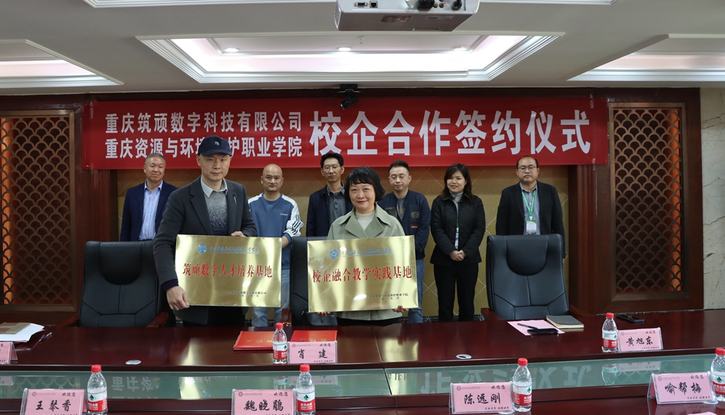 随后,魏晓鹃校长代表重庆资源与环境保护职业学院,肖建总经理代表重庆筑顽数字科技有限公司,双方在校企合作协议书上签字,魏晓鹃校长为企业授“校企融合教学实践基地”牌,肖建总经理为学校授“筑顽数字人才培养基地”牌。签约仪式结束后,双方共同研究了“建筑室内设计”专业的人才培养方案,对人才培养定位,岗位能力需求、课程设置、教学内容等内容进行了深入研讨。