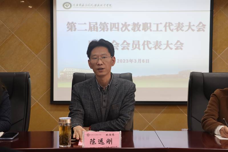 党委书记陈远刚致词,他表示,重庆资源与环境保护职业学院党委十分重视和支持学校教代会和工会工作,坚持不断强化学校民主政治建设,并对学校工会提出了几点意见。他指出,学校工会要坚持党的领导,牢牢把握正确的政治方向;要主动服务学校,全力助推学校事业发展;要积极履职、大力构建和谐劳动关系;要深化改革,切实提升工作能力,充分发挥工会桥梁纽带作用。