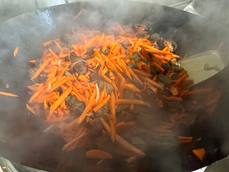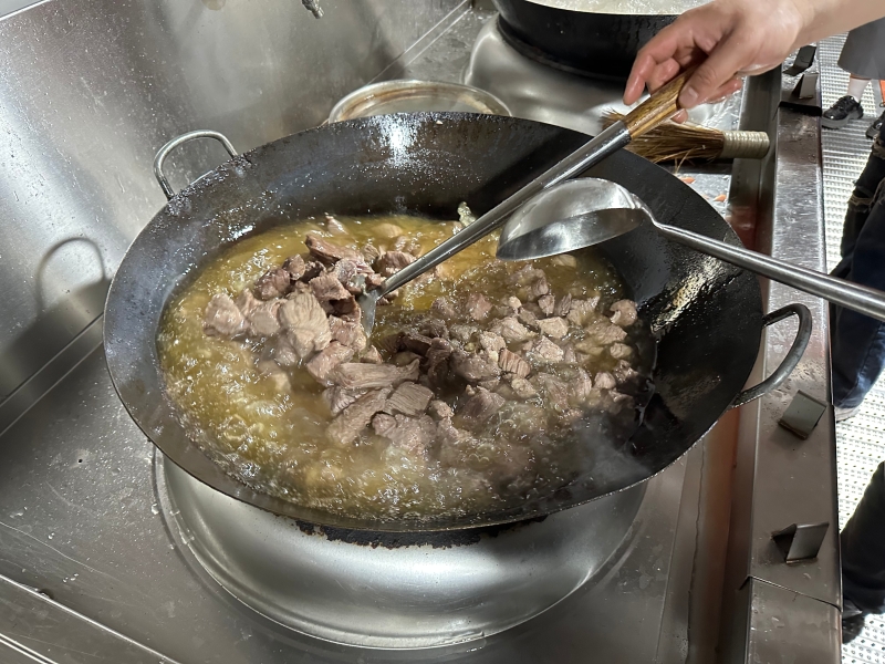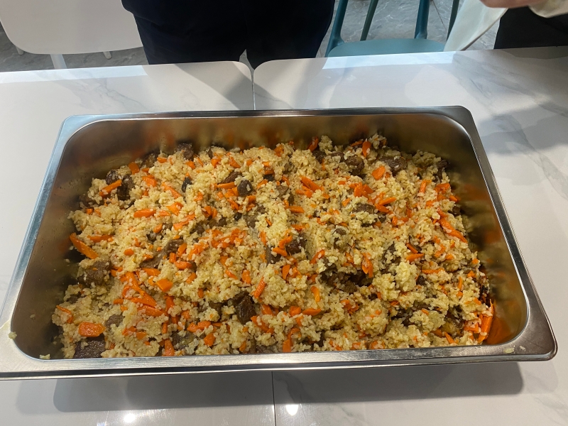 为了让新疆籍学子吃上地道的家乡美食,后勤部门的领导、食堂工作人员提前购置了新鲜牛肉、胡萝卜等食材。当天下午,参与活动的领导,辅导员和学生都早早的来到了手抓饭制作现场。同学们分工明确、精诚合作,清洗、切制、开火、倒油、翻炒、下米、倒水,动作一气呵成,干净利落,大家忙得不亦乐乎。两个小时左右,抓饭的香味就弥漫了整个餐厅。