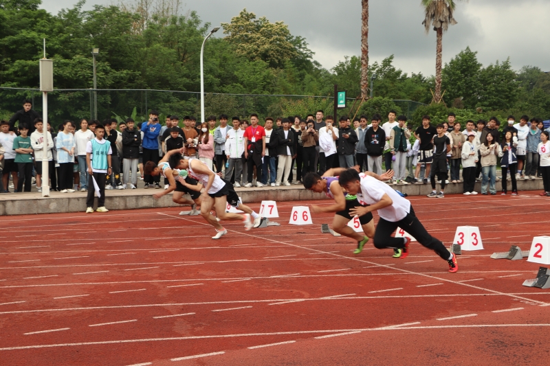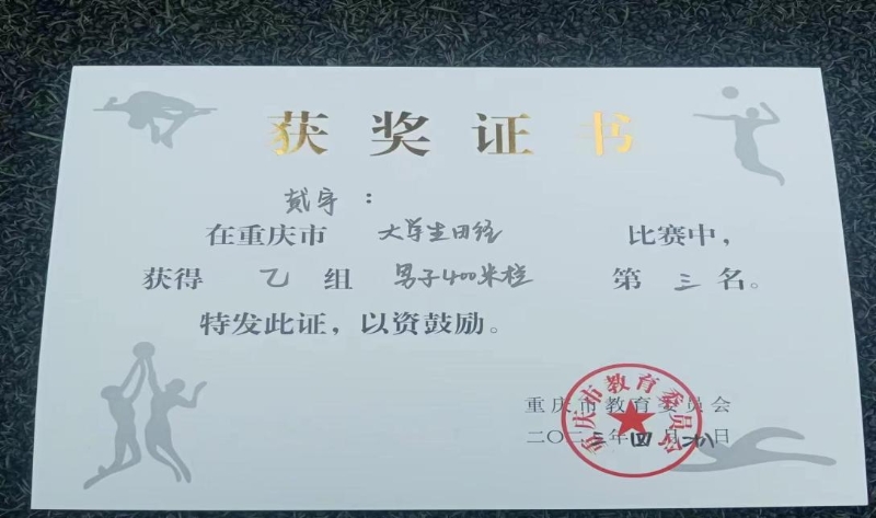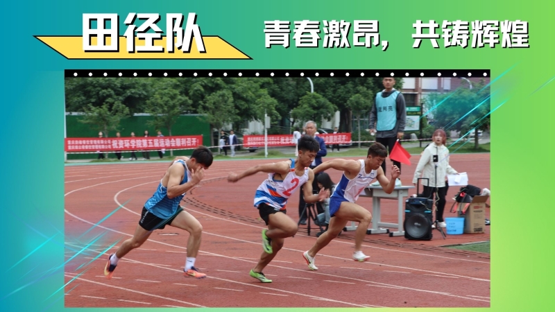我校田径队成立于2020年,它是一支敢于拼搏、团结奋进、勇于创新的队伍,是学校重点建设运动队之一。田径队保持优良的传统和锐意进取的精神,长年坚持利用课余时间有计划的进行科学系统的训练。在校内通过自身的训练活动,宣传带动广大同学参与体育锻炼,营造了积极、活跃、健康并富有特色的校园体育文化氛围,推动了学院的素质教育建设,更好的建设了校园精神文明环境。教师队伍因地制宜,因材施教,确保每一位运动员都能在每一次训练中有所收获,有所成长。除了训练时的严格要求,在思想教育层面,学校领导、老师也积极关心每一位成员,向学生传递永不放弃,奋勇拼搏的体育精神。2023重庆市大学生田径比赛开始前一月,即开始模拟比赛情况,适应比赛场地,为比赛做好万全准备。我校戴宇同学捷报频传,斩获了男子400米跨栏第三名,400米第八名的好成绩,并获得体育道德风尚奖。