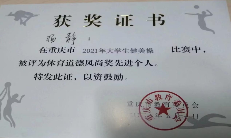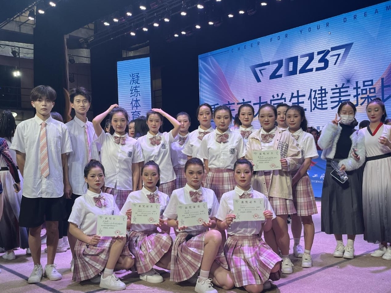 健美操队成立于2020年,姜英平、王俏老师担任教练。健美操队于2021、2022、2023年分别取得了重庆市大学生健美操比赛团体第六名、个人单项第五名、女子乙组单人竞技健美操第四名,其中,廖雨晴、张雨洁同学在比赛中取得了乙组双人街舞第四名,团体总分第六名的好成绩,张雨洁同学取得了女子乙组单人竞技健美操第四名。