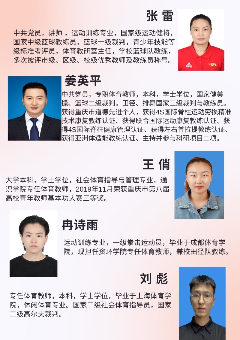 资环男子篮球队成立于2019年,是一支纪律严明、作风顽强的队伍。在张雷老师的指导下,于2019年、2020年、2021年参加重庆市大学生篮球联赛表现优异,并获得体育道德风尚奖。参加2021年重庆市大足区教育系统“建党100周年”暨第三届师生体育艺术节篮球比赛并获得一等奖;参加2022年重庆大足区学生篮球运动会(高校男子组)获得二等奖;参加2022年重庆市大学生篮球比赛获得第六名;2023年在大足区学生篮球运动会高校男子组比赛中夺得冠军。教练张雷多次被评为市、区级优秀教练员称号。