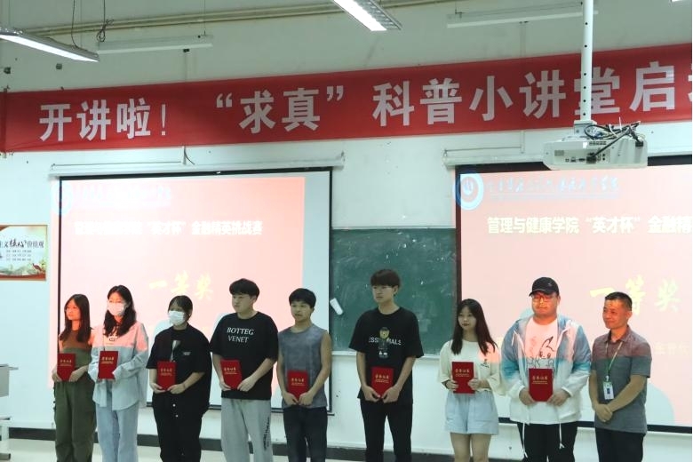 为深入学习贯彻党的二十大精神,落实立德树人根本任务,培养德技双馨的高素质技术技能人才,管理与健康学院根据学校《关于开展2023“技能成才,强国有我”系列教育活动的通知》要求,结合学院专业特点开展了首届“英才杯”心肺复苏技能大赛、POP健康海报设计大赛及金融挑战大赛、“参军报国,视不可挡”专题讲座、“医”路出彩爱心义诊活动、“诵读经典”比赛等一系列活动。5月29日晚上,管理与健康学院在实训楼S113教室举行“求真”科普小讲堂启动仪式暨五月职业教育活动月总结表彰大会。出席本次活动的领导有:常成国副校长、学生处袁兵处长、管理与健康学院唐红英院长、管理与健康学院金融财会教研室于中萍主任,以及管理与健康学院全体教师、辅导员和学生代表共计120余人参会。