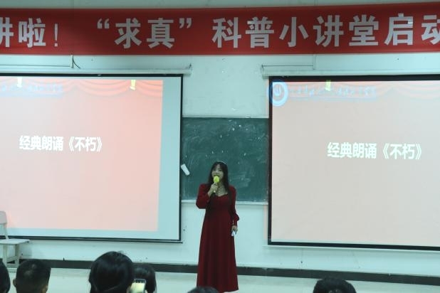 常成国副校长为此次科普小课堂暨表彰大会致辞,他指出:“求真”科普小讲堂的启动,是广大师生身体力行普及科学知识、提高科学素养和创新意识的一次有益尝试,与学校的“手脑并用、创新世界”的校训,“传承文明、启智求真”的校风,“勤学、善思、乐研、爱创”的学风高度契合。平台的搭建将为更多学子参与科普活动提供实践机会,能有效弥补目前学校科普资源短缺、科普阵地薄弱的现状。通过传授科普知识,能够促进学生学有所思,学有所用,提高学生的学习能力、沟通能力、表达能力和组织能力。