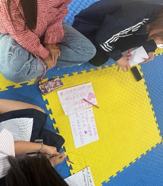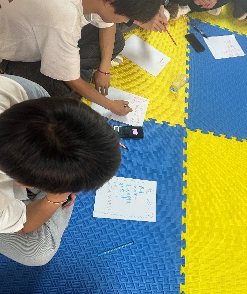 在热身运动之后由心理老师带领,同学们在纸上写出自己的优缺点进行“自我贴标签”环节,在由团队中其他成员的二次评价帮忙修整“标签”,撕去不客观不合理标签,帮助学生更加认清自身。