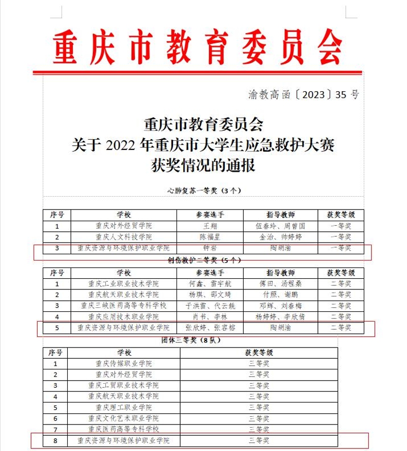 官宣了!我校在重庆市首届大学生应急救护大赛中斩获佳绩,学生钟岩获得心肺复苏一等奖,张欣婷、张容榕获得创伤救护二等奖,团队荣获团体三等奖。指导老师陶胡渝获得“优秀指导教师”,我校获得“优秀组织奖”。