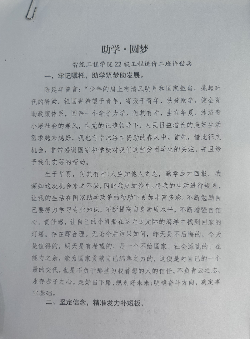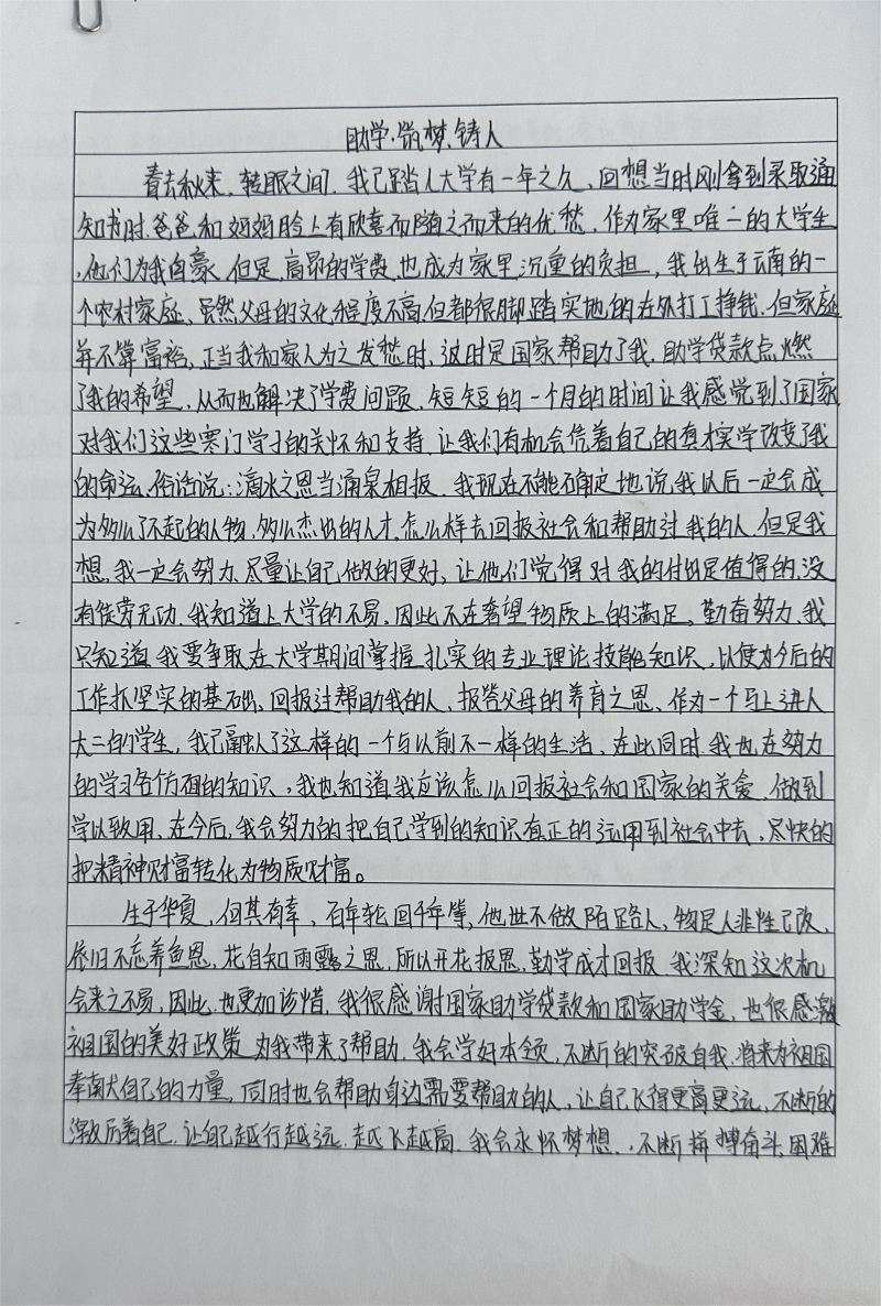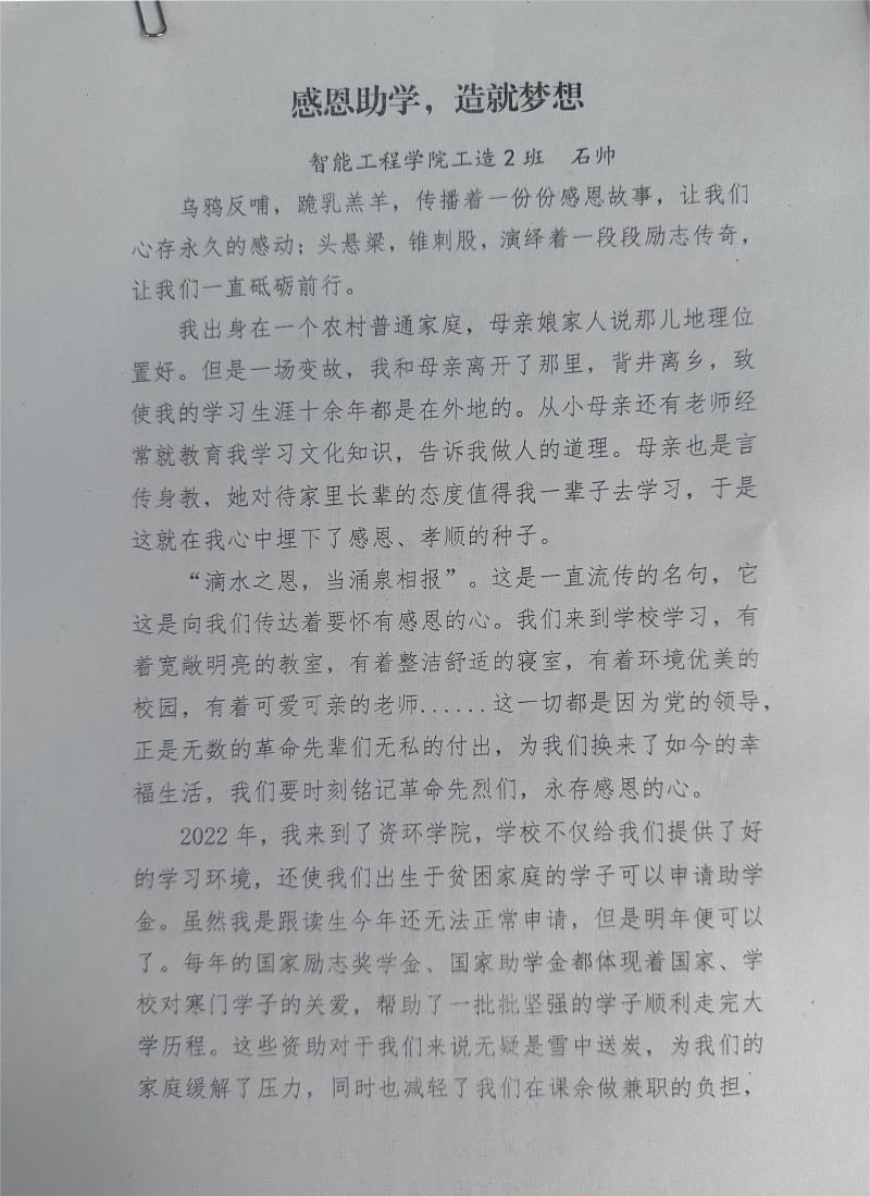 开展“助学筑梦·心光砺行”征文活动,鼓励学生用征文和视频、书法的形式展现大学期间感受到的爱和美,表达自己对英雄和祖国的崇敬、感恩之情。活动开展期间,同学们踊跃参与,用征文+视频相结合的方式,表达了自己的感恩之情。极大地调动了同学们的参赛积极性,丰富了同学们的校园文化生活,加强了师生之间的交流。