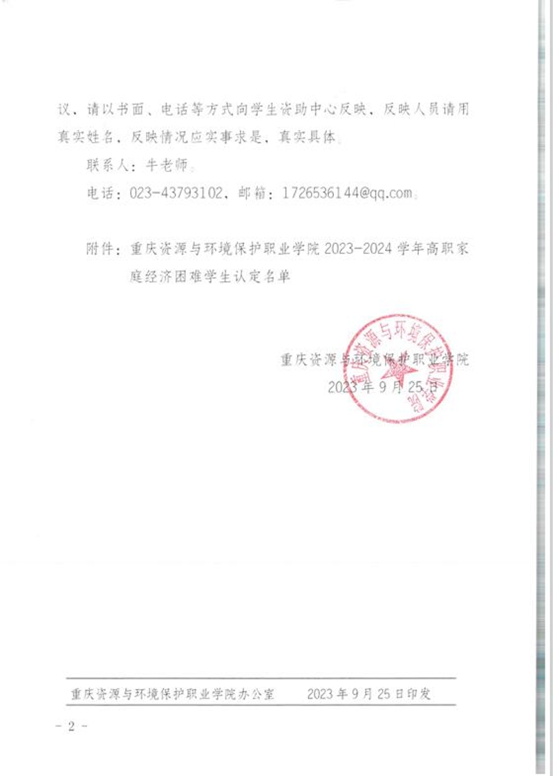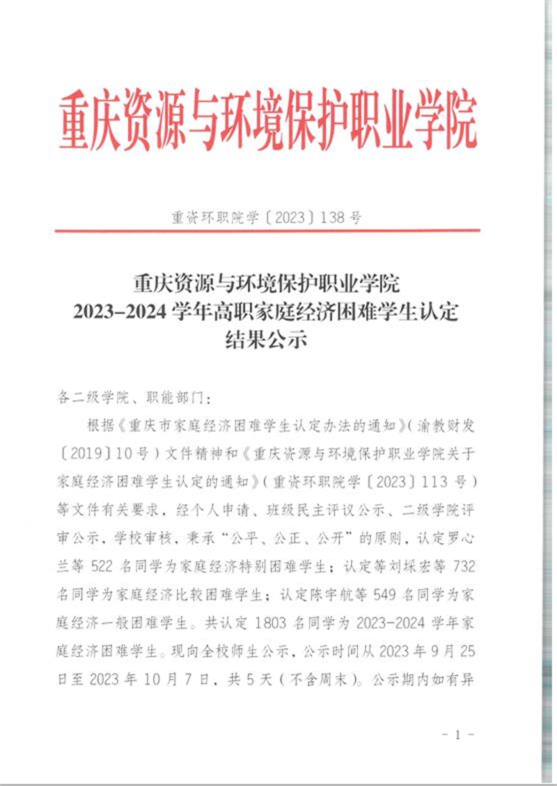 重资环职院〔2023〕138号2023-2024学年高职家庭经济困难学生认定 结果公示