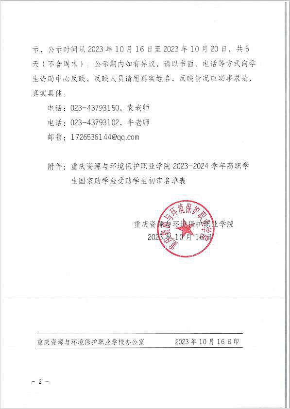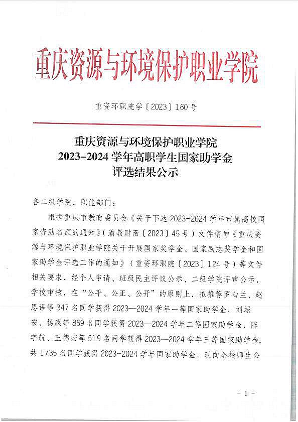 重庆资源与环境保护职业学院2023-2024学年高职学生国家助学金评选结果公示文件