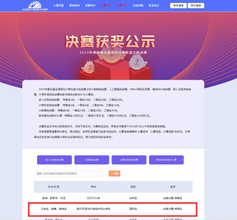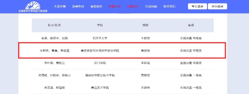 重庆资源与环境保护职业学院高度重视学生实践能力的培养,坚持以学生成长为中心,不断推行“以赛育人、以赛促学、以赛促教、以赛促能”的人才培养模式,旨在培养有理论水平、有工匠精神、有就业竞争力、有创业本领的一流应用性复合型人才。今后,学校将会进一步加强对学生参加学科竞赛的指导和支持,帮助学生在科研实践中行以致远、追求卓越!