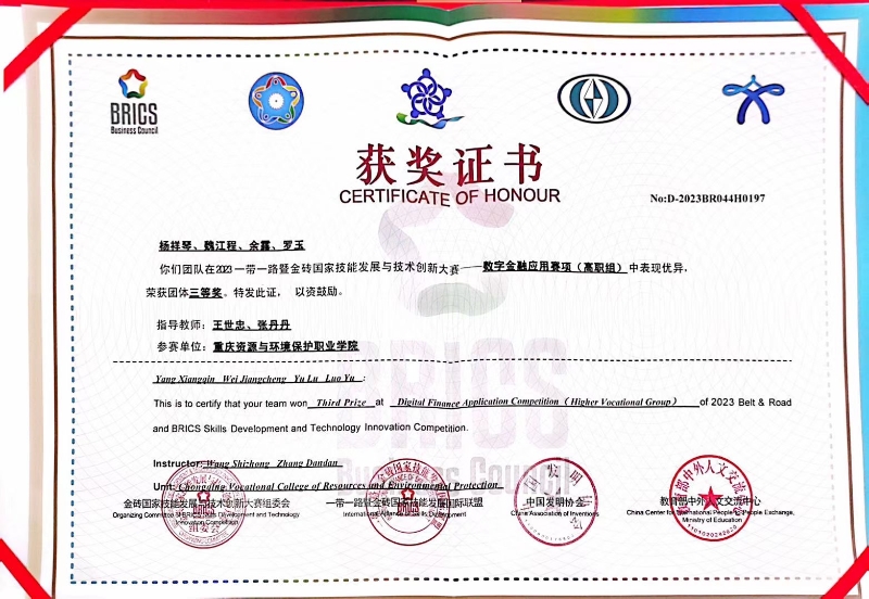 近日,2023年一带一路暨金砖国家技能发展与技术创新大赛之数字金融应用赛项全国总决赛成功举行。此次数字金融应用赛项分为金融业务素养、创新金融业务、数字金融业务区块链金融业务等模块,旨在对接金融行业的快速发展需求,引领金融新专业建设。我校金融专业参赛选手与来自全国141所职业院校晋级选手同台竞技,最终斩获全国总决赛高职组三等奖。
