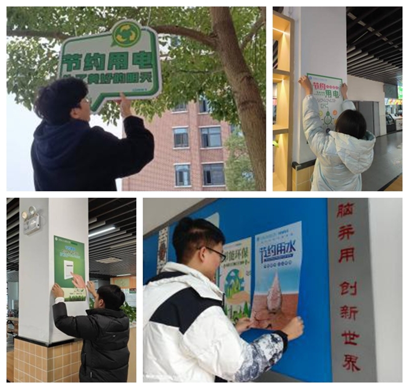 志愿者们在校园醒目处张贴宣传标语、悬挂标牌,起到提示和教育作用。