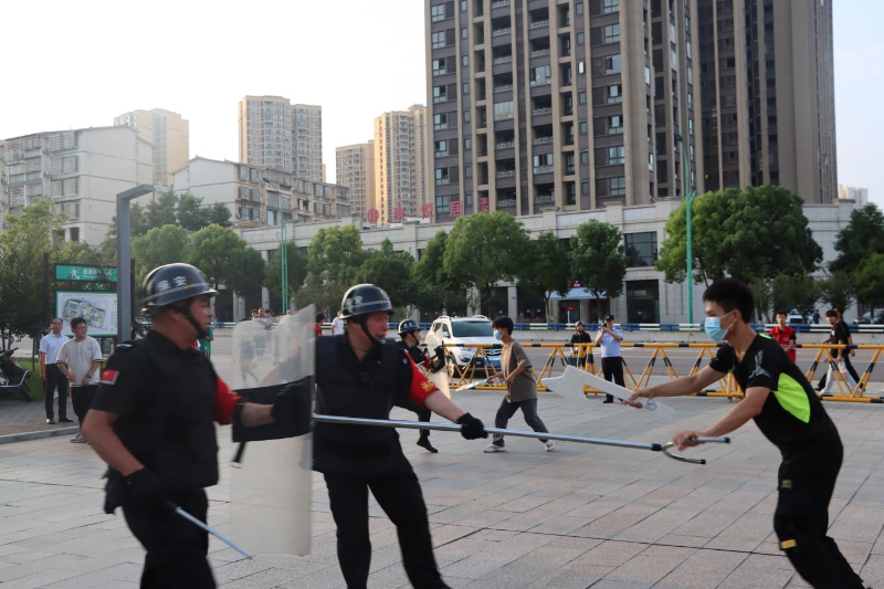 在掌握了理论知识后,安保人员随即投入到紧张逼真的反恐演练中。演练模拟了两名“暴徒”企图强行闯入校园的场景。学校安保人员迅速反应,按照培训所学,利用防暴盾牌、钢叉等器械与“暴徒”展开激烈对抗。同时,迅速启动应急预案,及时报警并通知校内师生采取避险措施。在安保人员的紧密协作和果断处置下,“暴徒”最终被成功制服,演练取得圆满成功。