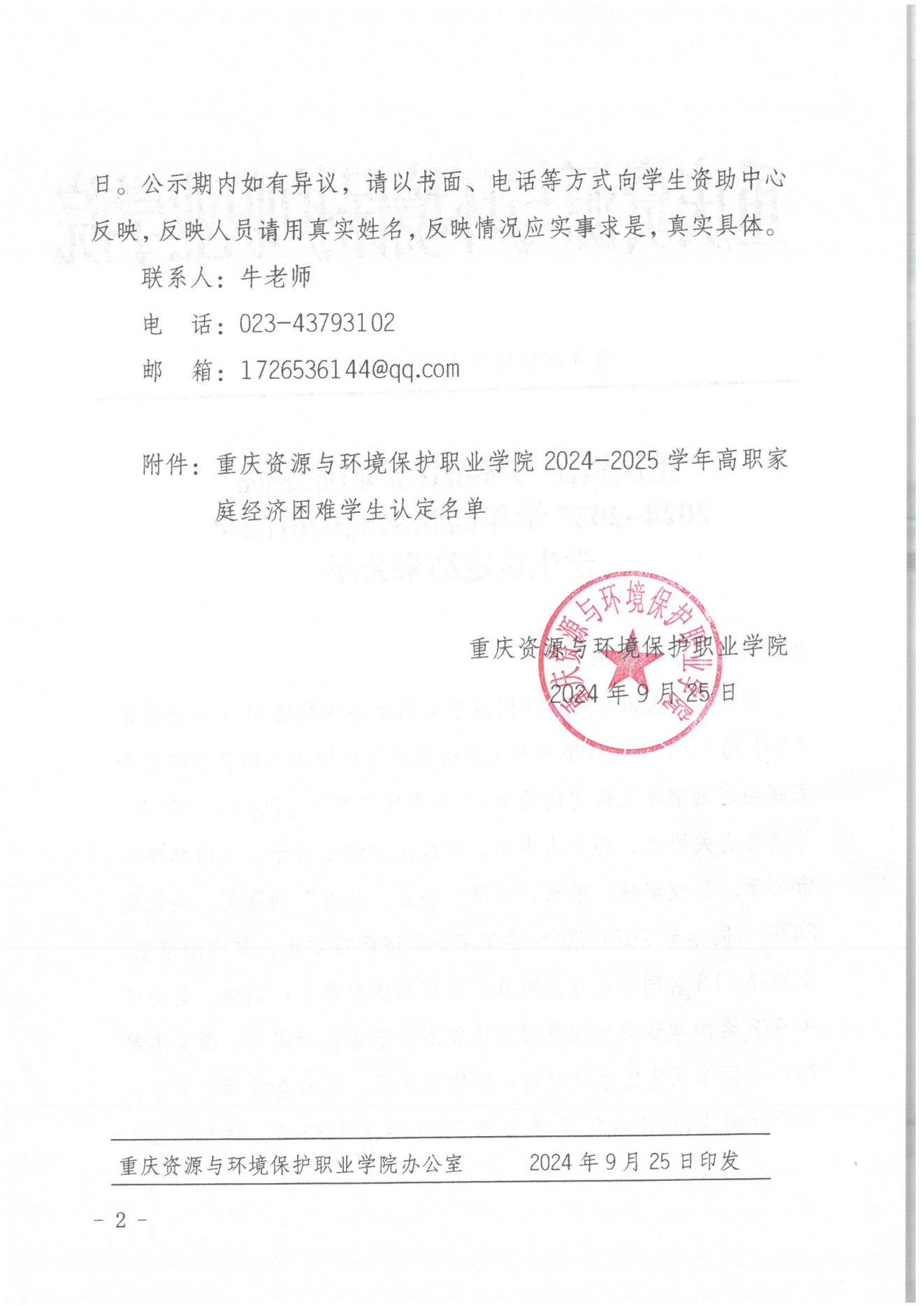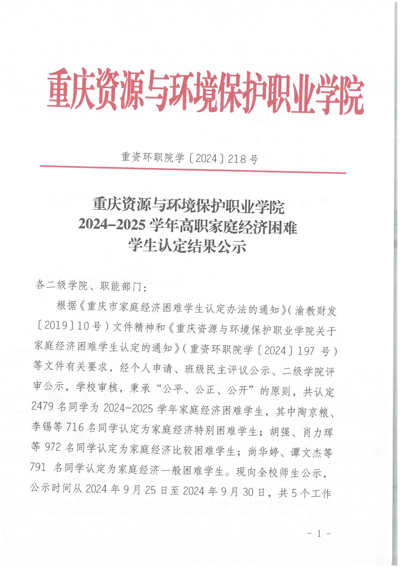 重资环职院〔2024〕218号2024-2025学年高职家庭经济困难学生认定结果公示