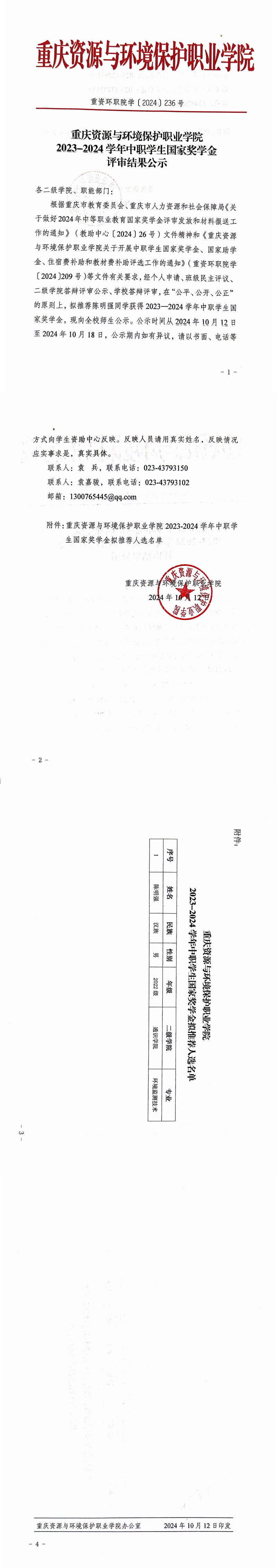 重庆资源与环境保护职业学院2023-2024学年中职学生国家奖学金评审结果公示